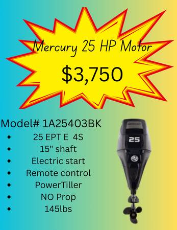We are an authorized Mercury dealer with motors in stock. 9.9hp manual start-$1850 9.9hp electric start-$1850 15hp electric start $2700 25hp remote control-$3750 115 hp electric stat $9375 300HP...