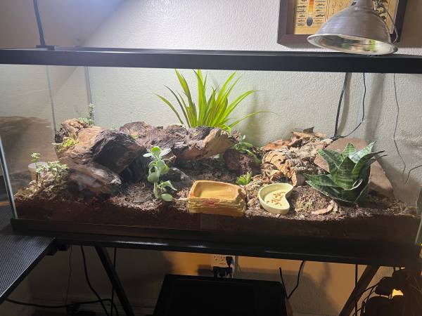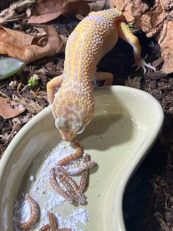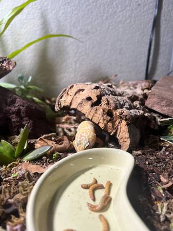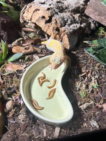 Rehoming my leopard gecko Dragonite with his 40 gallon terrarium. Comes with everything in the tank, the heat lamp with a 60 water ceramic heat emitter, and the led light. Dragonite is about 7-8 months old and he is very active as soon as the lights go off. He has never bitten anyone and does alright with handling. Very good eater and loves it when you hand feed him and he has never dropped his tail. Looking for him to go to a good home