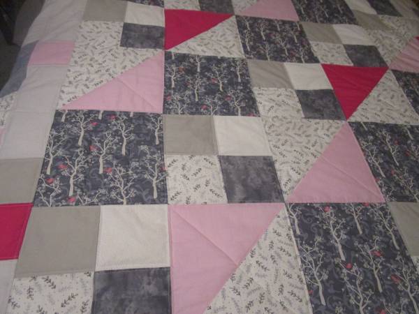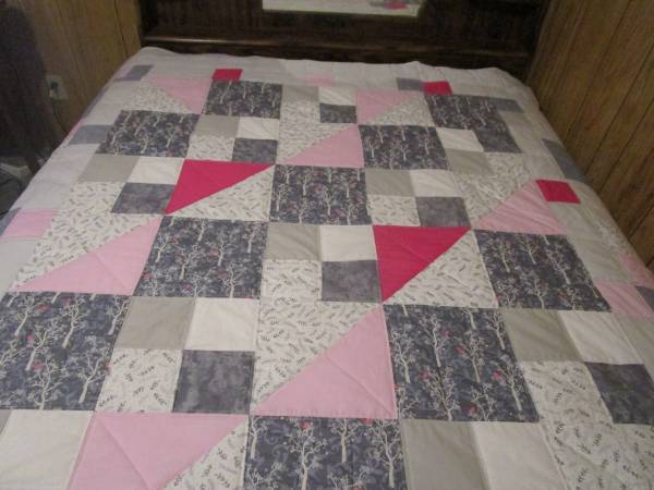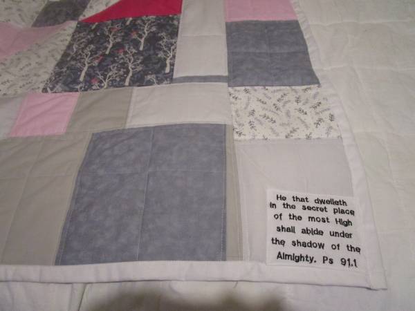 This hand sewn quilt is machine quilted. It has the cutest little pink birds on white trees. It measures 70" x 90" with the scripture Psalm 91:1 embroidered on the corner.