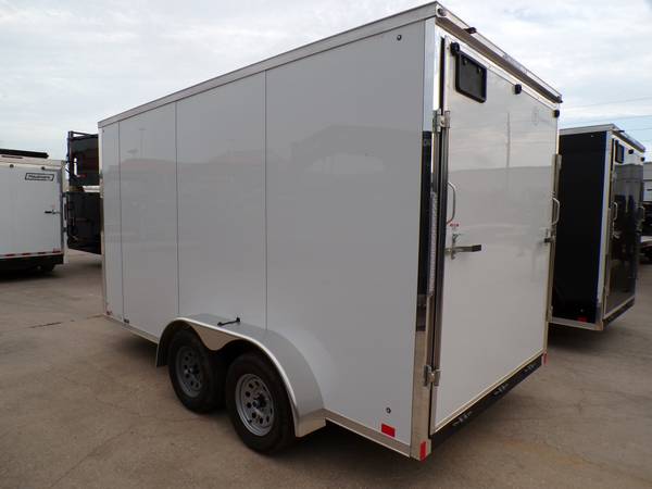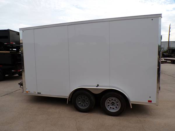 7X14 ALPHA SERIES 7 Pin Electrical Plug 4 Way Electric Brakes with Breakaway kit Flat Top Exterior White Out L.E.D. Lighting DOT Approved Lighting and Safety Equipment Limited 3 Year Warranty Arrow Wedge 12" Additional Height - 84" Total Interior Height 2" X 4" Welded Tubular Steel Main Frame 16" On Center Crossmembers 16" On Center Walls and Roof Studs 11,600# Safety Chains with Clevis Hook 10,000# Chain Holder 3500# Spring Tandem Axles ST205/75R15 LRD Radials 2 5/16" Coupler On A-Frame 5,000# Top Crank A-Frame Jack Ramp Door With Spring Assist and Flap 32" Curbside Econo RV Door - 76" Tall Opening 3/8" Water Resistant Walls 3/4" Water Resistant Floor 080 ACP Exterior Upgrade .080 ACP White Translucent Roof Screwless Unit 24" ATP Gravel Guard 12 Volt Wall Switch 12 Volt LED Dome Light - 800 Lumens