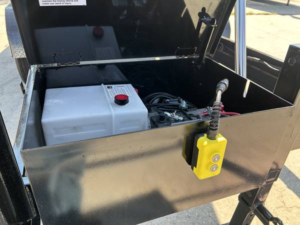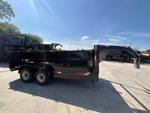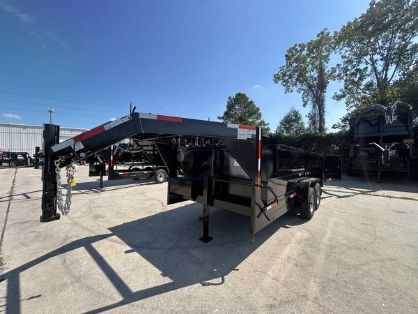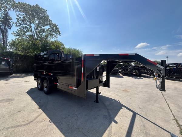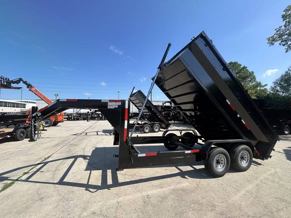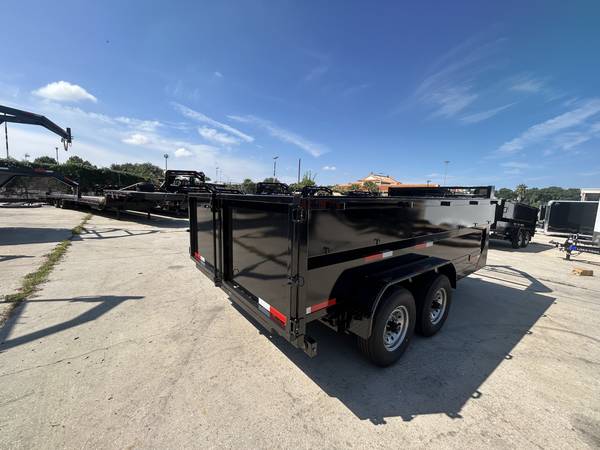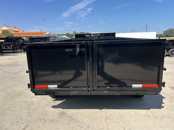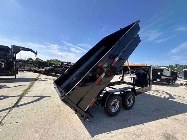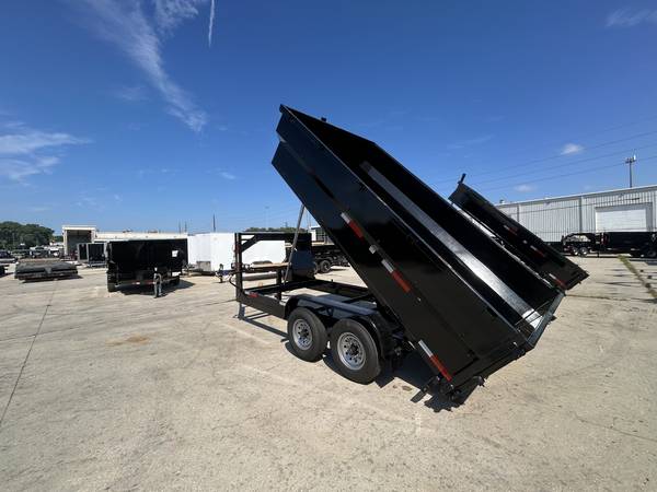 New TP DT71414KGN 82"x14' Dump Trailer with 36" sides Ramps are included in Price!! TARP IS NOT INCLUDED BUT AVAILABLE FOR PURCHASE !! Trunnion Mount Dual 7,000 lb Direct Lube 8 lug (electric brakes on both axles) Heavy Duty Slipper Spring Suspension New 16" ST235/80R16 10ply radial LRE Double swing doors (open like barn doors) Electric over hydraulic - power up / gravity down Front locking tool box - contains battery and pump Multi stage trunnion mount telescopic cylinder 12,000 lb drop leg jack All flush mount or recessed LED stop / turn / clearance lighting U.S. made sealed modular wiring harness DOT required emergency break-a-way kit and conspicuity tape & Prop Rod Fully primed and painted with automotive grade acrylic enamel Bed Sides and Floor is 1/8" thick sheet steel