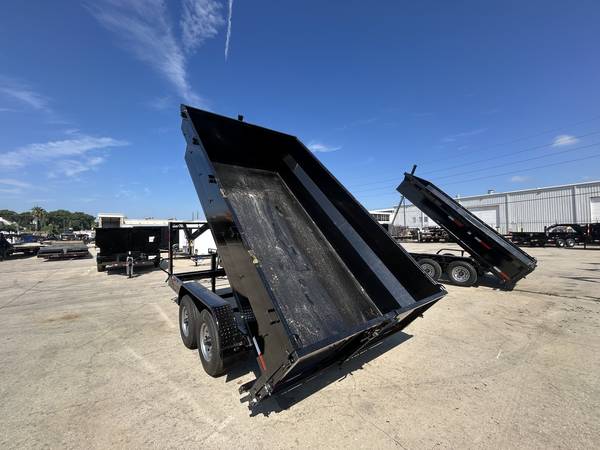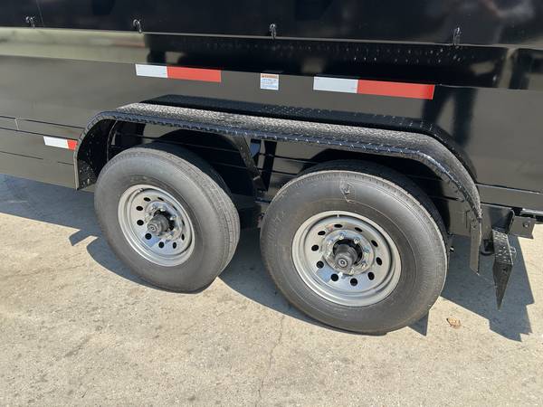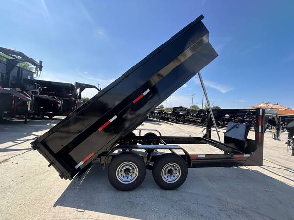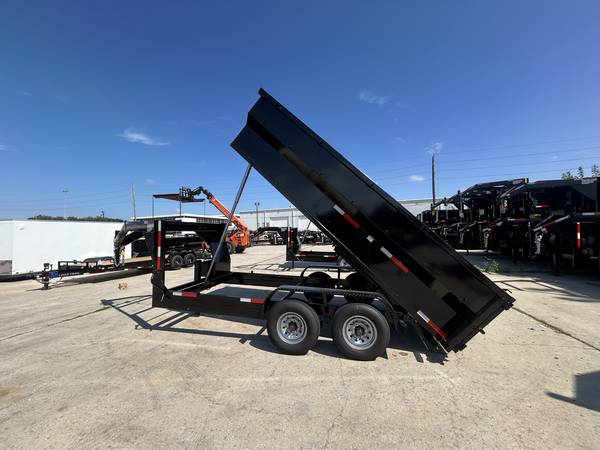 New TP DT71414KGN 82"x14' Dump Trailer with 36" sides Ramps are included in Price!! TARP IS NOT INCLUDED BUT AVAILABLE FOR PURCHASE !! Trunnion Mount Dual 7,000 lb Direct Lube 8 lug (electric brakes on both axles) Heavy Duty Slipper Spring Suspension New 16" ST235/80R16 10ply radial LRE Double swing doors (open like barn doors) Electric over hydraulic - power up / gravity down Front locking tool box - contains battery and pump Multi stage trunnion mount telescopic cylinder 12,000 lb drop leg jack All flush mount or recessed LED stop / turn / clearance lighting U.S. made sealed modular wiring harness DOT required emergency break-a-way kit and conspicuity tape & Prop Rod Fully primed and painted with automotive grade acrylic enamel Bed Sides and Floor is 1/8" thick sheet steel
